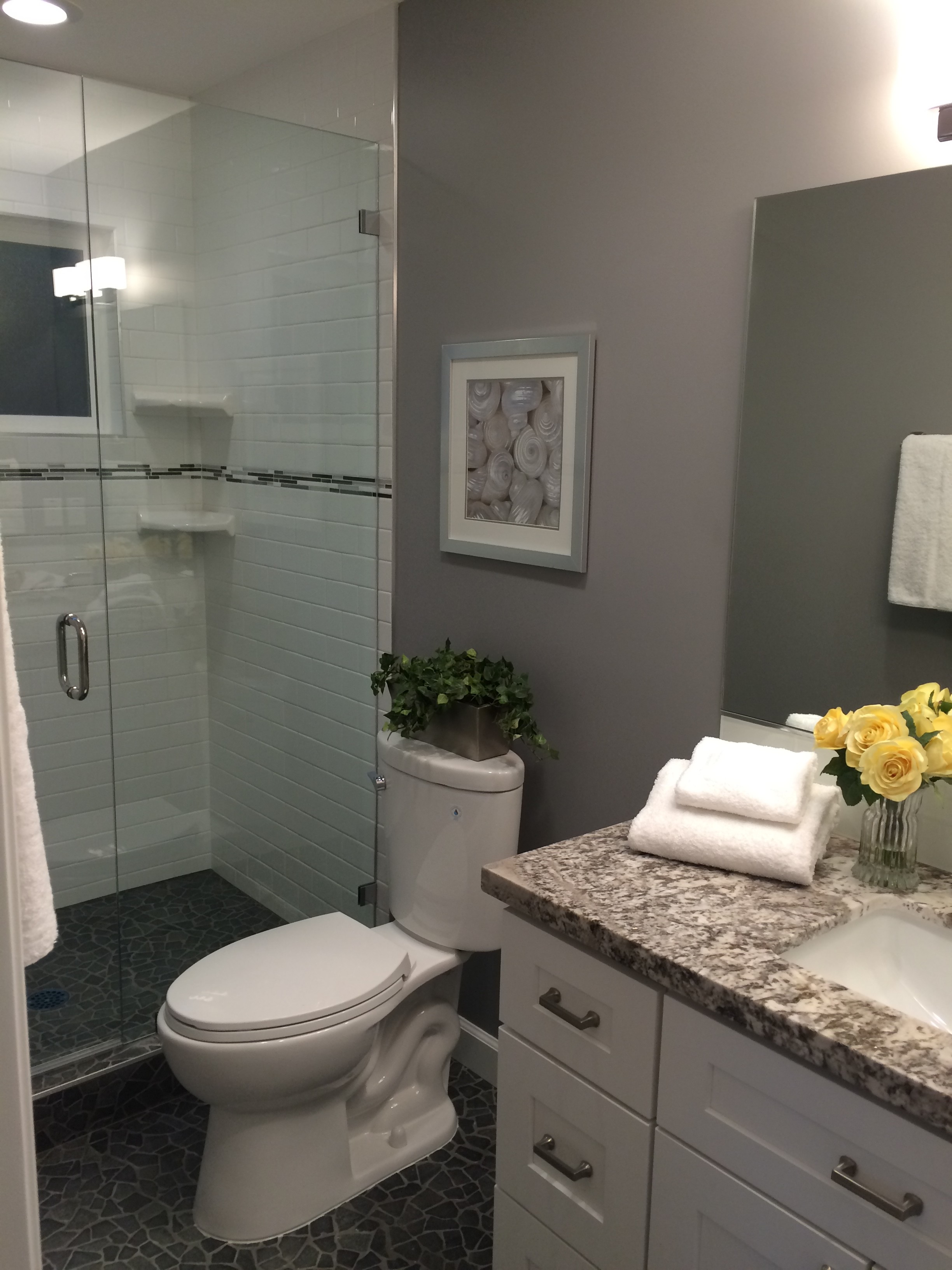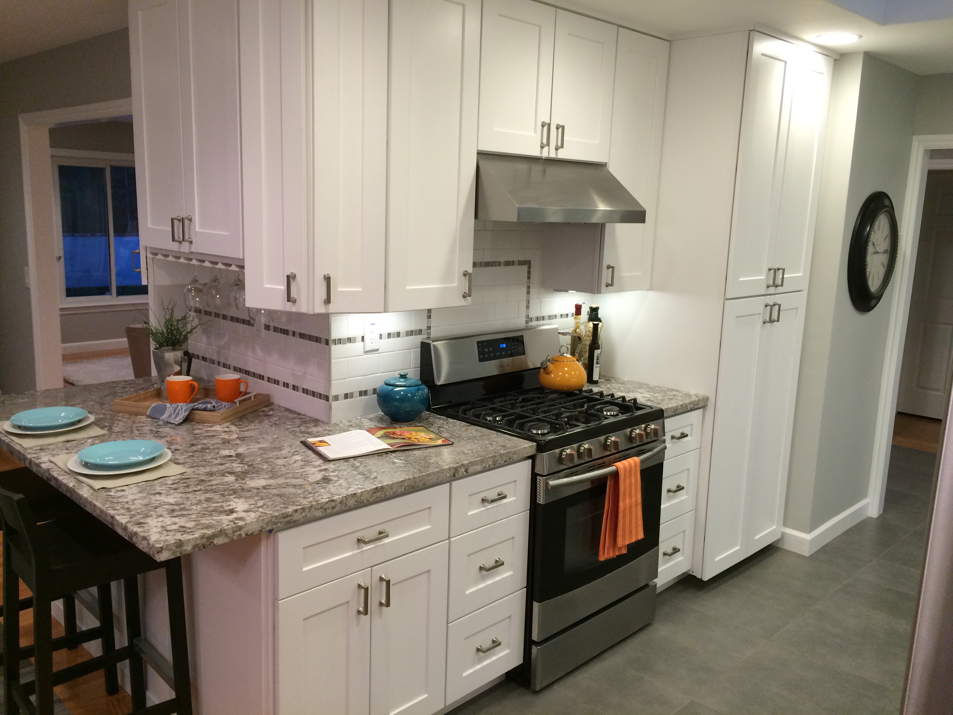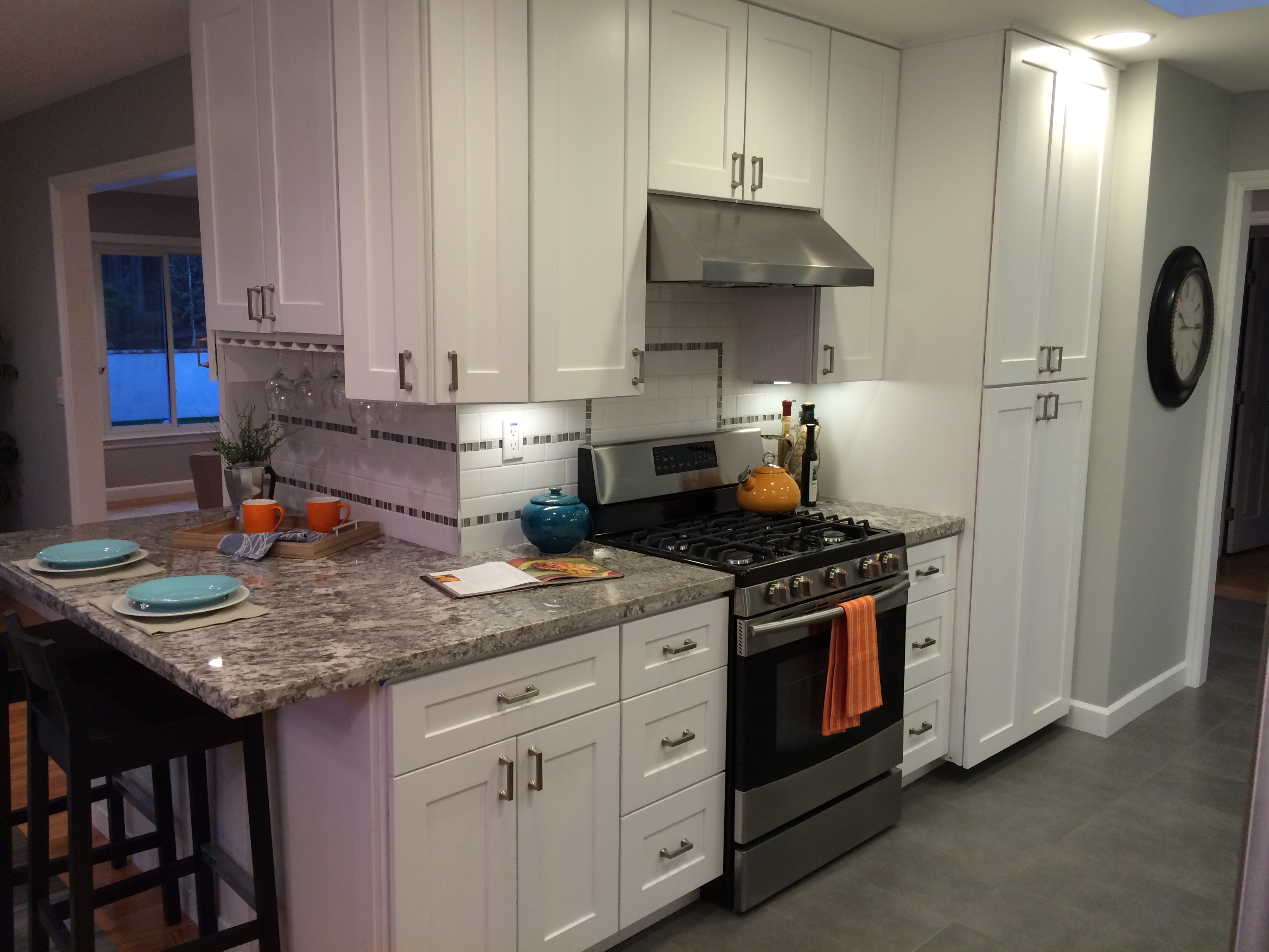 For kitchen and bathrooms we used semi-custom cabinetry with shaker style doors, appliances and plumbing fixtures were owner-select. For ceramic tile in bathrooms we used local suppliers and matched the original interior design with tile stock items.
